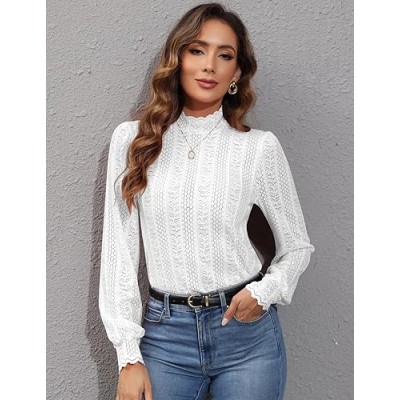 Women Lace Shirts Mock Neck Long Sleeve Top Casual Blouses Stretch Lace Slim T Shirt