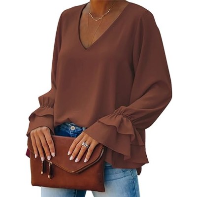 Women's Casual V Neck Tiered Ruffle Bell Long Sleeve Blouse Shirt Tunic Top