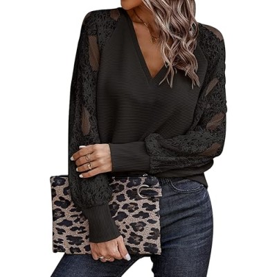 Womens V Neck Puff Lace Long Sleeve Crochet Hollow Out Long Sleeve Shirts