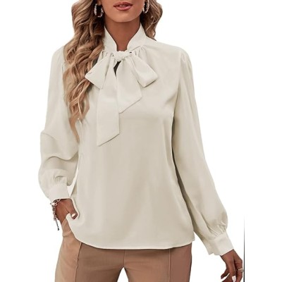 Women's Bow Tie Neck Long Sleeve Buttton Cuff Chiffon Elegant Blouse