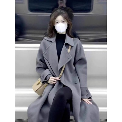 2024 New Gray Windbreaker Mid-Length High-Quality Temperament Korean Hepburn Style Woolen Coat
