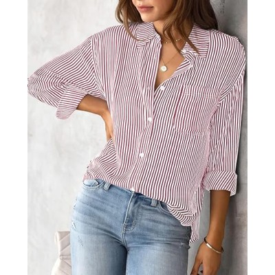 Womens Button Down Shirts Striped Classic Long Sleeve Collared Office Work Blouses