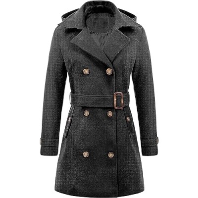 Women's Double Breasted Pea Coat Hooded Long Winter Trench Coat