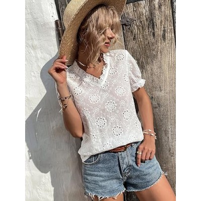 Women's Summer Ruffle Trim Eyelet Floral Embroidery Shirt