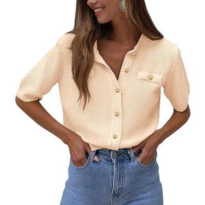 Women's Summer Button Down Shirts Casual Short Sleeve Crew Neck Ribbed Knit Blouse Top Cardigans