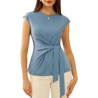Womens Cap Sleeve Tops Summer Tie Waist Crew Neck Elegant Blouse