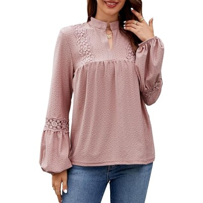 Women's Eyelet Lace Blouse Top Notch V Neck Long Sleeve Blouse Shirt Casual Derssy
