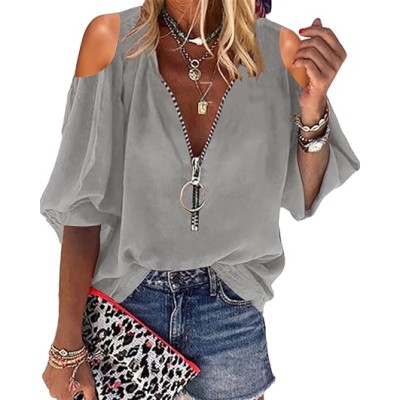Womens V-Neck Lantern Sleeve Blouse Zipper Design Loose Casual Top Shirts