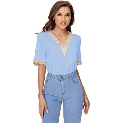 Women's Guipure Lace Deep V Neck Short Sleeve Shirt Colorblock Blouse Top