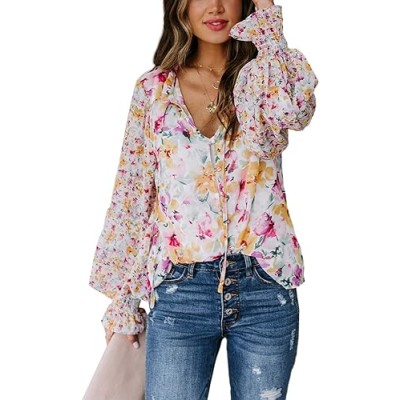 Women's Casual Boho Floral Print V Neck Long Sleeve Drawstring Tops Loose Blouses