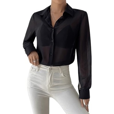 Women's Sheer Mesh Button Up Shirt Long Sleeve See Through Blouse