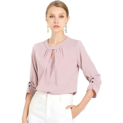Women's Work Office Keyhole Pleated Front Ruched 3/4 Sleeve Shirt Chiffon Blouse
