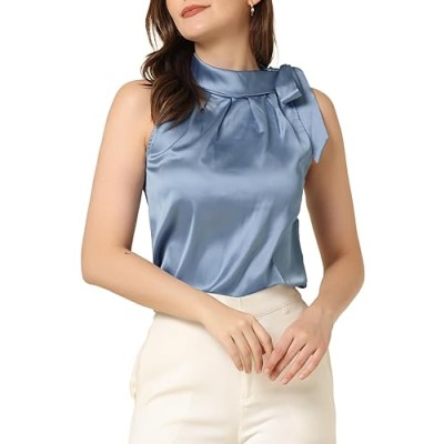 Women's Elegant Satin Sleeveless Tie Knot Mock Neck Solid Work Blouse Top